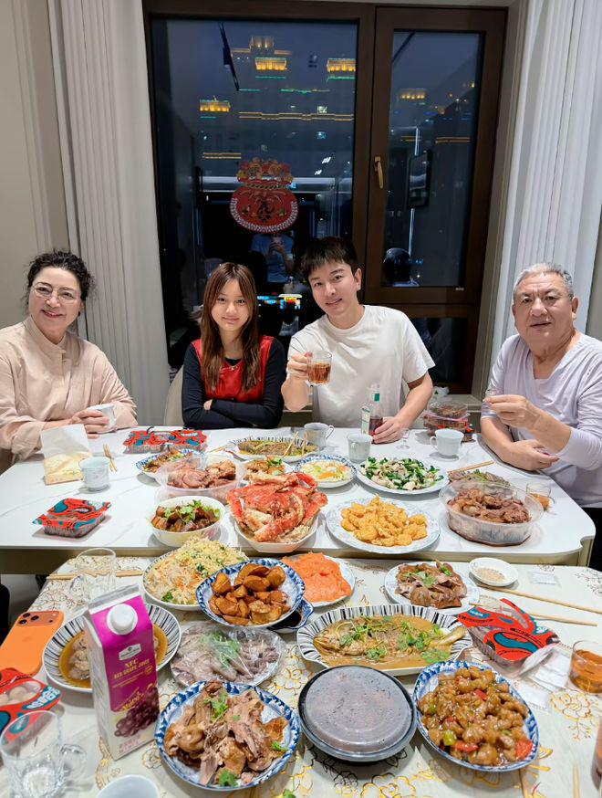 贾乃亮晒出吃年夜饭的合影,他和甜馨以及父母一起对着镜头笑容温和。从现场画面来看,甜馨应该是和爸爸这边的家人一起过年,两张桌子摆在一起,以及窗户上的倒影能看出这应该是十分热闹的一大家人。