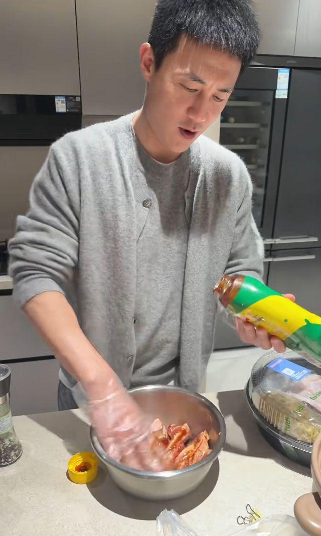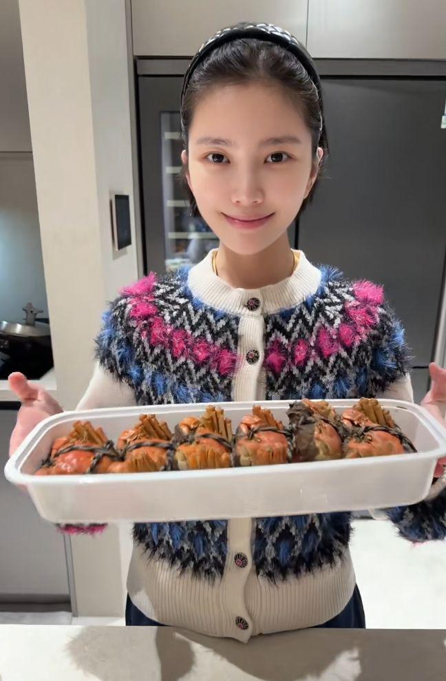 杜淳王灿夫妇也是亲自动手,杜淳十分熟练的腌制肉类,王灿则拿着一盘蒸好的大闸蟹展示给大家。