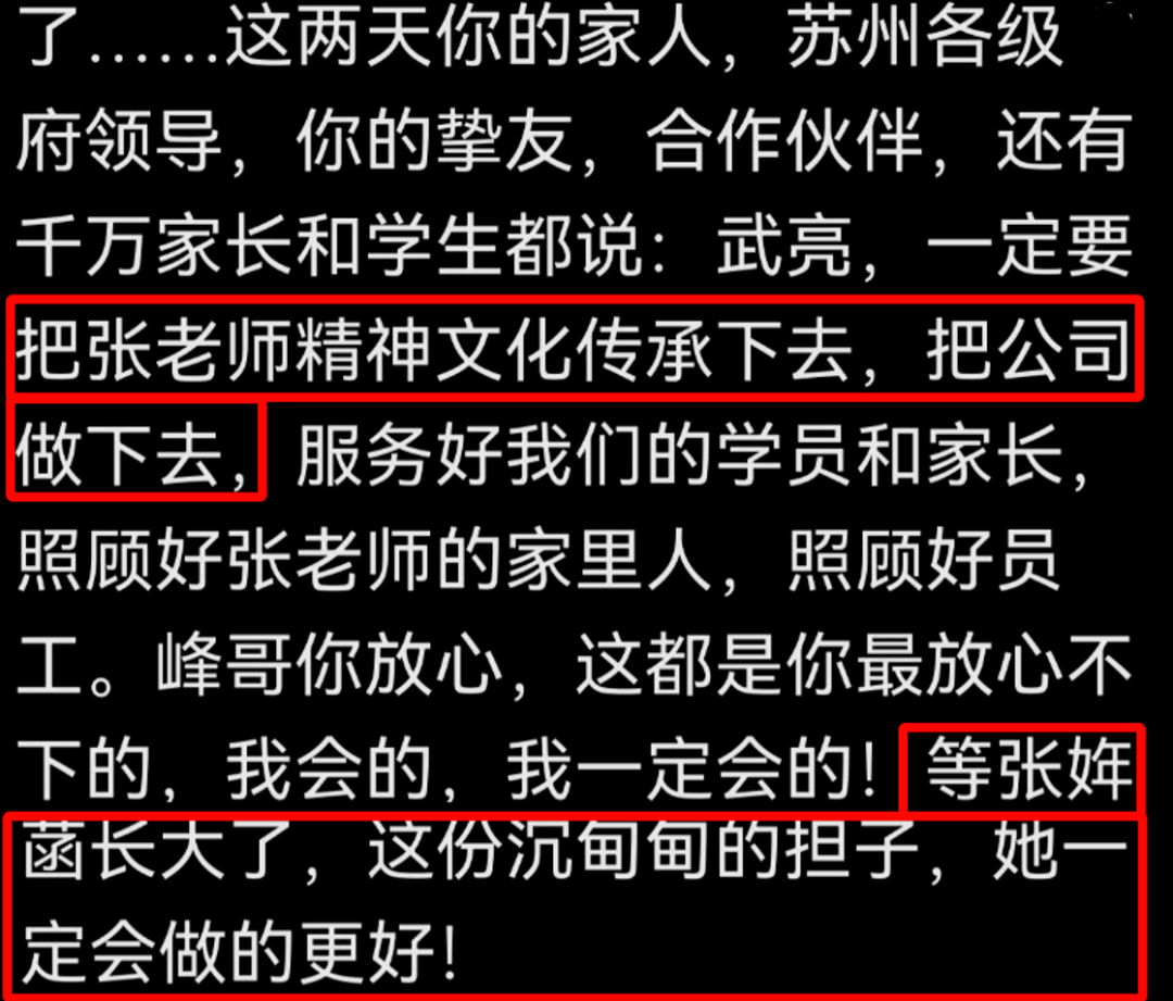 张老师公司的总经理武亮发文悼念张老师,回忆了很多两人的相处往事,两人的关系非常好,是兄弟也像父子,武亮也表示这几天收到了不少领导和合作伙伴的鼓励,他承诺一定会把张老师的精神文化传下去,把公司继续做下去,照顾好张老师家人和员工。