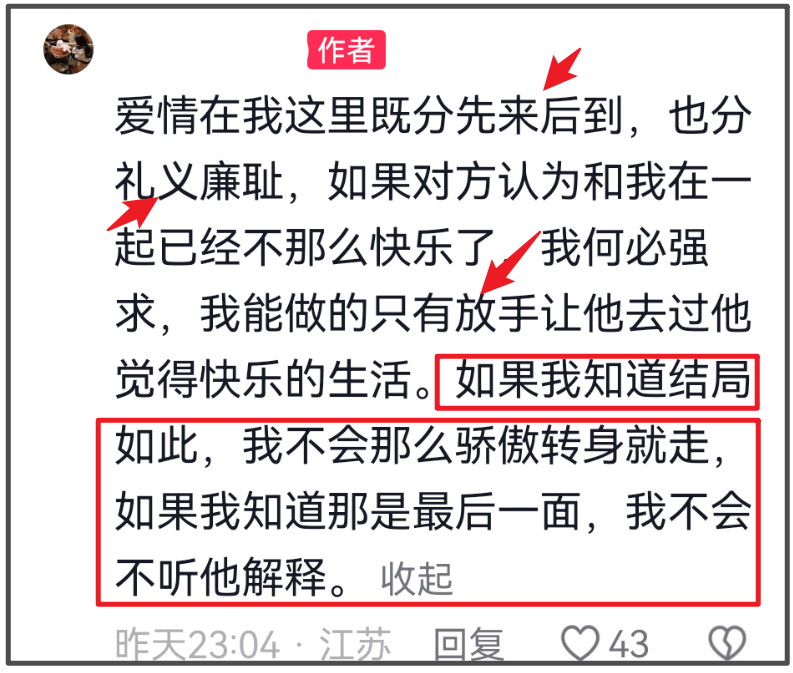 张梦婷还在评论区回复网友,又是“先来后到”,又是“礼义廉耻”,又是“放手让他快乐”,话里话外似乎两人的分手还有隐情。而前任也明确表示自己后悔,如果早知道是如今的结局,早知是最后一面,当初分手不会那么骄傲离开,不听解释。