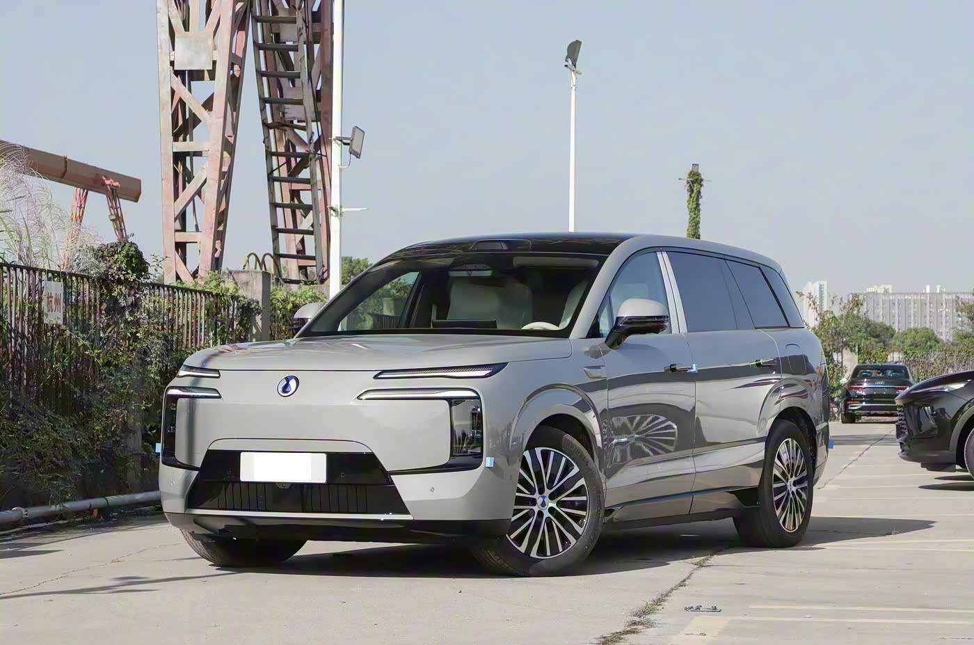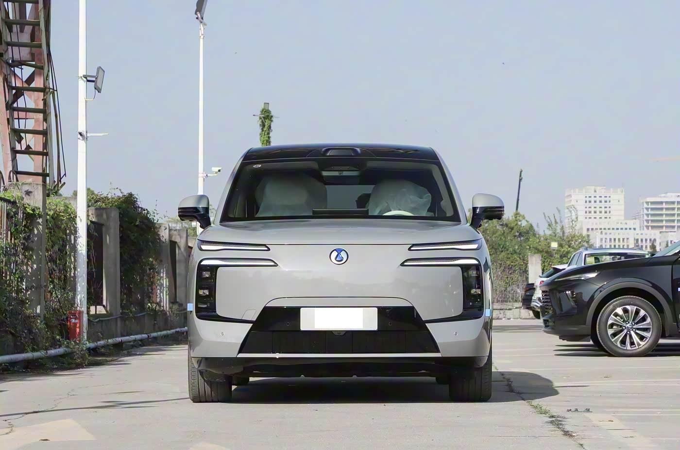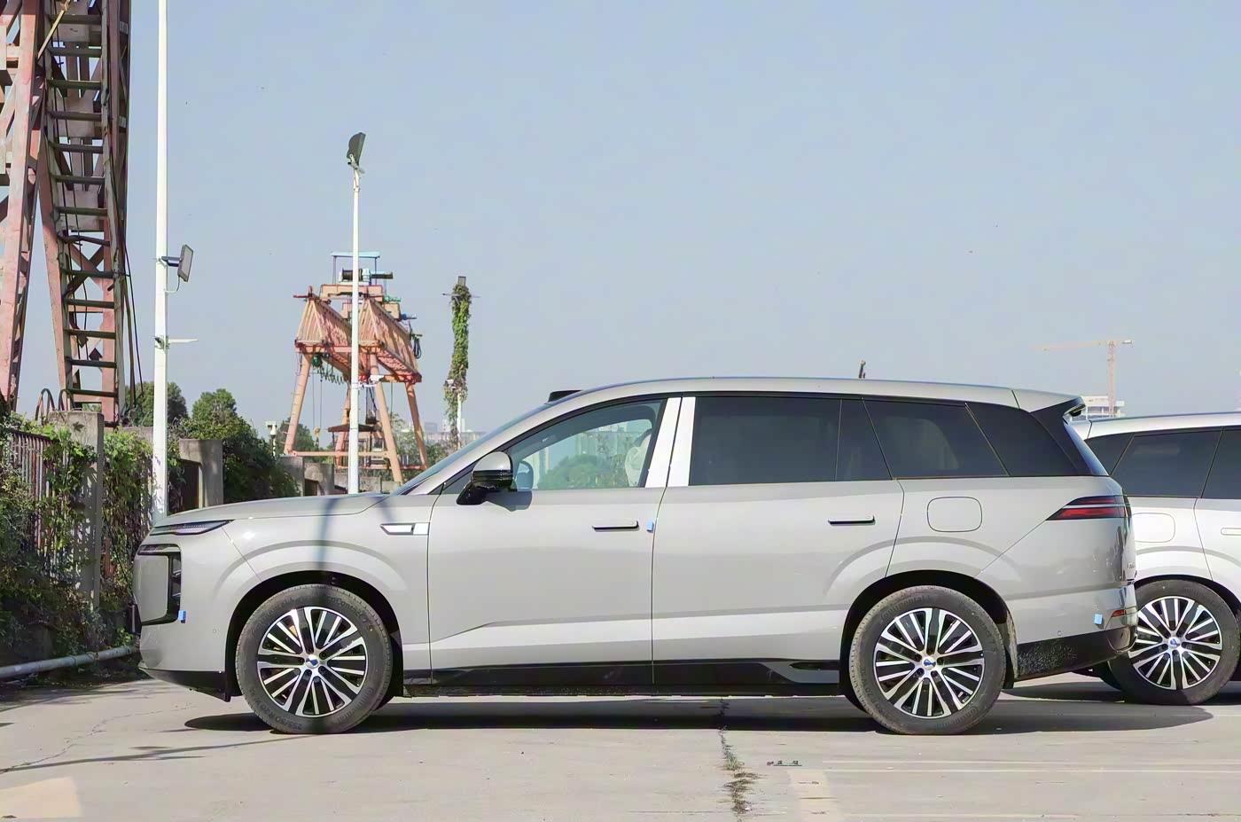 我们首先来看新车的外观设计方面,车头设计将功能主义与机甲美学深度融合。家族式无边界格栅采用参数化点阵布局,搭配可自动调节的 AGS 智能进气格栅,实现散热与风阻的动态平衡。核心亮点是 “星际战舰” 分层灯组:竖向主光源如同航天器推进器,双平行日行灯点亮时呈现脉冲式动态效果,配合激光雷达集成的流线型整流罩,科技感扑面而来。前包围的三段式散热开口搭配银色下护板,既强化硬派气质,又为 2.0T 发动机提供高效散热,彻底打破大型 SUV 的臃肿感。