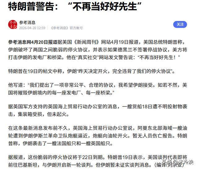 4月19日,特朗普公然在社交平台高调喊话,声称己方拟定的协议公平合理,还大放厥词,扬言只要拒绝妥协,就彻底摧毁对方发电厂、桥梁等关键设施。